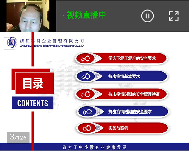 课程内容包括:1、常态下复工复产安全生产要求;2、抗击新冠病毒疫情的基本要求;3、特殊时期的安全管理特征;4、抗疫时期的安全生产要求;5、实务与案例。本次线上公益培训引导和教育企业员工提高安全意识,掌握疫情防控相关知识,帮助企业在疫情期间练好内功,夯实复工复产基础。