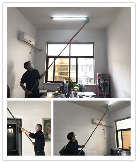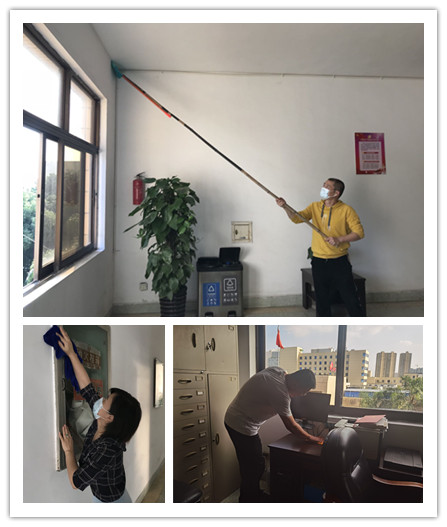 活动过程中,院内人员利用扫把、报纸等常用工具对墙角堆积已久的蜘蛛网丝进行仔细清扫,确保墙体重新焕发光彩。由于院内硬件设施相对较为老旧,不少顶部墙皮开始发黄脱落,一遇雨天容易滴漏渗水,徐金民院长凡事亲力亲为,亲自拿着组装过的扫把将这些脱落墙皮处理干净。员工们巧思妙想,利用自己各自的生活小妙招给绿植扫除尘埃,将宣传栏清洗干净。