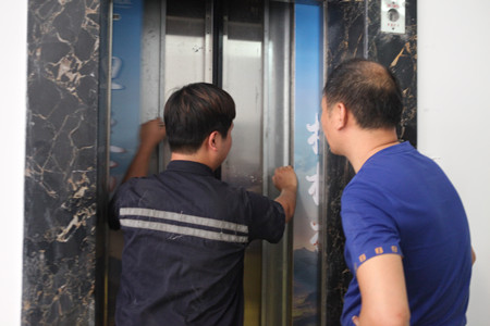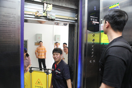 模拟演习过程中,各部门安全生产员分成两批,依次进入电梯轿厢进行演习体验,感受被困轿厢的当下情绪。电梯发生故障后,停止运行,出现平层错位现象(平层错位是指电梯在平层停靠时,轿门地坎没有与厅门地坎在同一平行线内),轿厢内灯光全数熄灭。维保人员通过亲身演示,给各位安全生产员解释在此种紧急情况下应当如何处理危险并迅速消除故障,让电梯恢复正常运行。