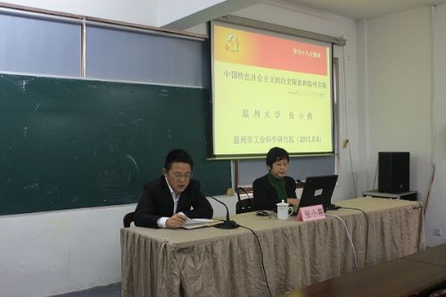 张小燕教授做了题为《中国特色社会主义的实践探索、中国特色社会主义的温州实践》的报告。张教授概括论述了十八大报告的主要精神,及全党全国人民关心的有关话题,并结合温州、我院学习贯彻十八大精神的实际,谈古论今、深入浅出、活泼生动、十分风趣的进行讲解,与会人员十分专注地听讲,受到了深刻的教育和启发,大家一致表示,今后要在十八大精神的指引下,为我院的新发展添砖加瓦,贡献力量。