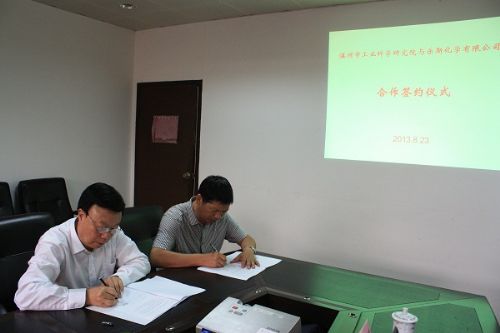 8月23日下午,中国乐斯化学有限公司董事长陈呈新一行三人前来我院参观访问,并与我院签订合作协议共建研发中心。 陈董事长一行参观了我院实验室,并进行了座谈。会上,院长徐金民表示“院企合作”的形式有助于科技成果转化,有助于发挥我院公共创新服务平台的作用和优势,有助于帮助企业进行产品、技术、工艺的创新开发,提高科技成果产业化水平,实现共同发展。