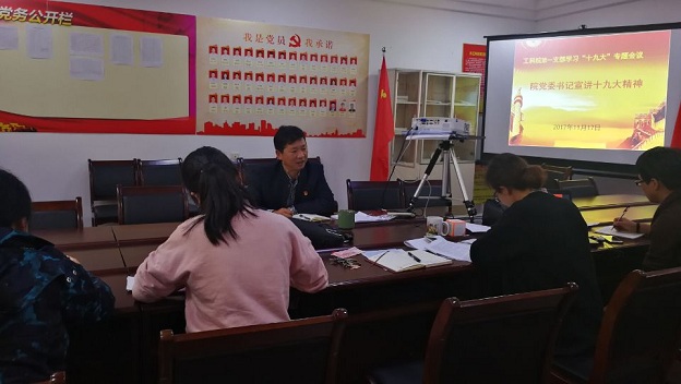 院党委书记徐金民为支部党员讲党课,他指出十九大在中国特色社会主义事业发展进程中具有跨时代的里程碑意义,认真学习好、宣传好、贯彻好党的十九大精神,是当前和今后一个时期的首要政治任务。每位党员要牢牢把握本次大会的主题,深刻理解社会主要矛盾的变化、新时代中国特色社会主义思想和基本方略等内容。徐金民强调,党员要增强学习本领、政治领导本领、改革创新本领、科学发展本领,依法执政本领、群众工作本领、狠抓落实本领、驾驭风险本领等“八个本领”,不忘初心,牢记使命,争做有情怀、有作为、有担当的“三有”党员。