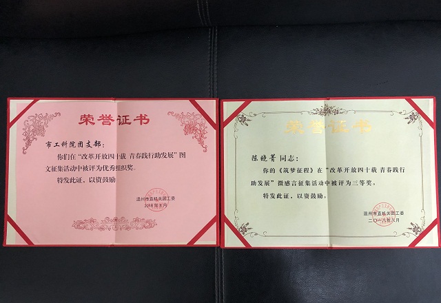 在我院团支部的组织下,团员青年踊跃投稿,从不同角度展现改革开放四十周年来温州取得的辉煌成就。其中我院陈晓菁、邵天时分获文字类、图片类三等奖,我院团支部喜获优秀组织奖。