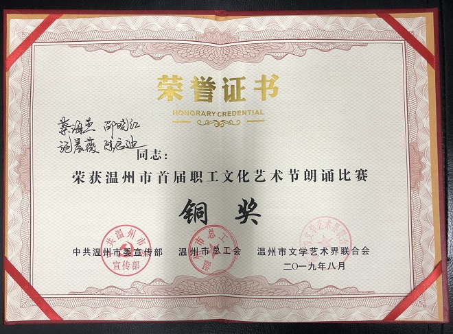 最终,我院选手荣获了“祖国好 劳动美”温州市首届职工文化艺术节朗诵比赛的铜奖。