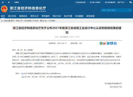 日前,浙江省经济和信息化厅公布了2021年度浙江省省级工业设计中心认定及复核结果。经企业自主申请、所在地经信局初审、专家评审和公示,温州市创意设计有限公司被认定为2021年度浙江省工业设计中心。同时,我院工业设计创新中心(温州市创意设计有限公司)也是本批次认定的温州市唯一一家省级工业设计中心的工业设计企业。