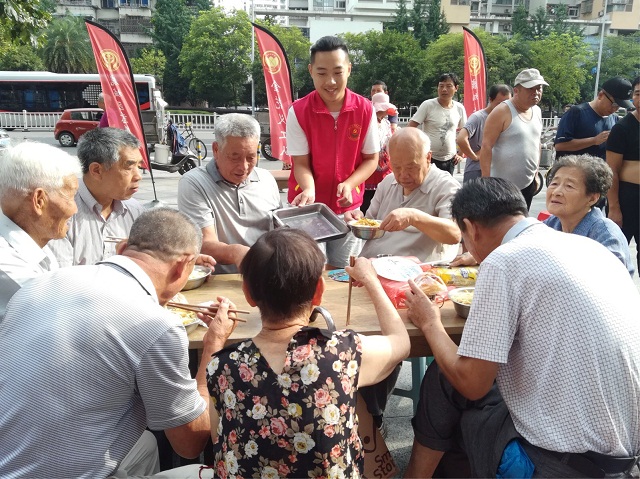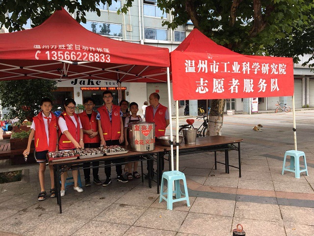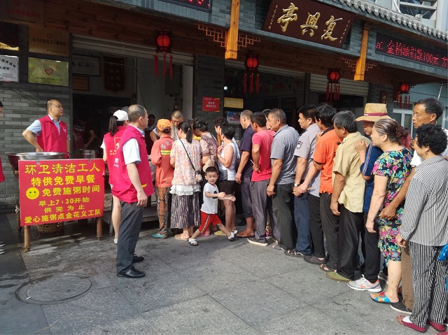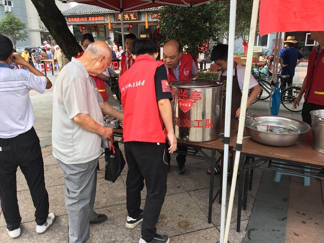 伴随着清晨的缕缕微光,志愿者们早早地来到了复兴大厦,他们抓紧每一分每一秒的时间,迅速穿上红马甲,加入了忙碌中。在金花义工队刘队长的指导下,他们协助摆放桌椅,整理场地,维护现场秩序。这边附近的居民、路过的行人和环卫工人早早排起了长队。“当心烫”,待厨师煮好面,志愿者便把一碗碗热腾腾的面条送到群众手中。另一边,在支起了伏茶摊后,志愿者们为环卫工人们送上一杯杯解暑伏茶。随后,在刘队长的带领下,我院志愿者们把热腾腾的早餐逐户送到了行动不便的老人家中。老人们接过东西,脸上笑开了花,纷纷竖起了大拇指,表扬志愿者的行动让他们感受到了家的温暖。