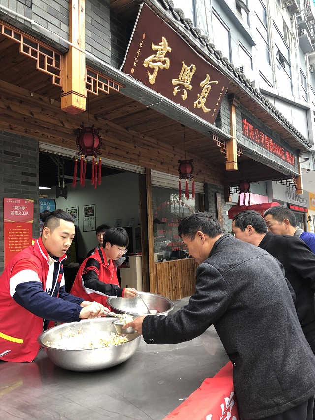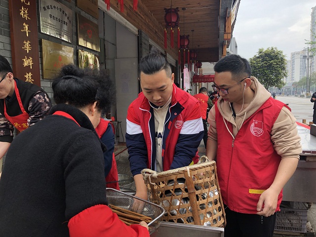 在金花义工队刘队长的指导下,他们协助摆放桌椅,整理场地,维护现场秩序。附近的居民、路过的行人和环卫工人早早排起了长队。待厨师炒完饭,志愿者便把一碗碗热腾腾的炒饭和紫菜汤盛到碗里,送到群众手中。随后,志愿者们开始清洗碗筷。这边用洗洁精清洗,那边流动水冲洗,最后沥干收纳放进消毒柜。紧接着,在刘队长的带领下,我院志愿者们把热腾腾的早餐逐户送到了行动不便的老人家中。老人们接过早餐,脸上笑开了花,高兴地竖起了大拇指,表扬志愿者的行动让他们感受到了家一般的温暖。