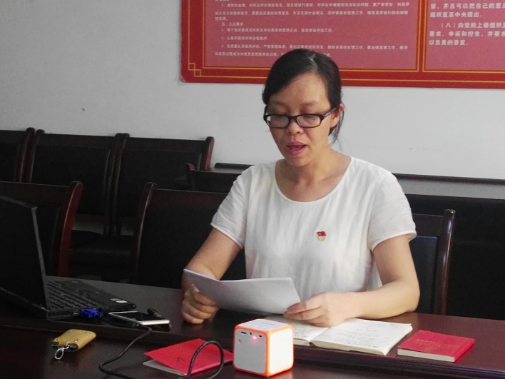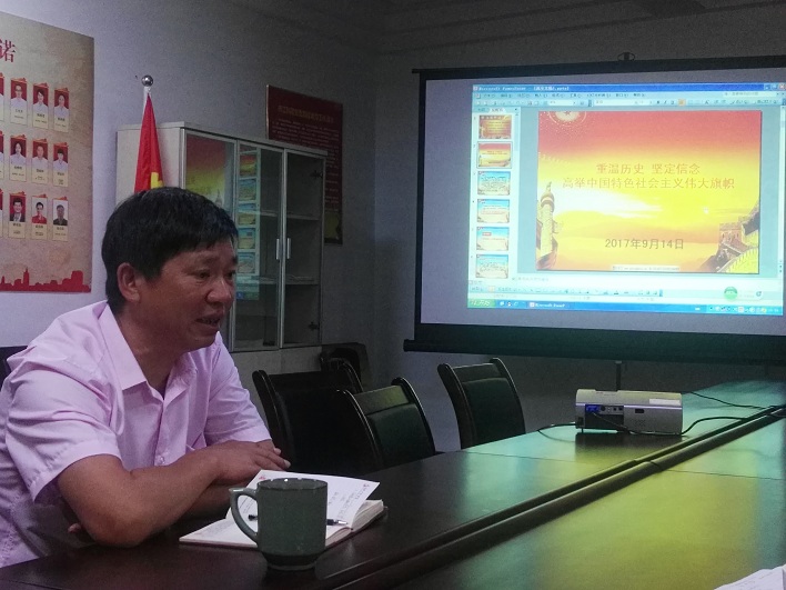 9月15日下午,我院第一党支部在党员活动室开展9月份的主题党日活动,支部书记顾雪萍主持了活动。活动开始,第一支部党员全体肃立,高唱国歌,面向党旗重温入党誓词。伴随组织委员邵晓红的朗读,大家集体学习了党章第十条关于党的组织制度的内容。之后邵晓红公布上月的党费收缴情况,党委书记徐金民当场带头缴足本月党费。进入本月主题的微党课环节,支部书记顾雪萍播放精心准备的PPT,做了题为《重温历史 坚定信念 高举中国特色社会主义伟大旗帜》的演讲,从习近平总书记726讲话主旨出发,回顾了我党的光辉历史和中国特色社会主义的形成发展,尤其是十八大以来推进全面从严治党的一系列重大部署,确保了我党始终成为中国特色社会主义事业的坚强领导核心。徐金民书记为本次主题党日活动做了点评和总结,既肯定了大家的学习热情和努力付出,又指出学习党的知识必须多管齐下,达到营造氛围、入脑入心的效果。徐书记强调微党课更适宜结合当前工作实际,以点带面,以小见大,力求更加深入人心。第一支部党员们纷纷表示将加强学习领会,在今后不断完善主题党日活动计划,提高主题党日活动效果。