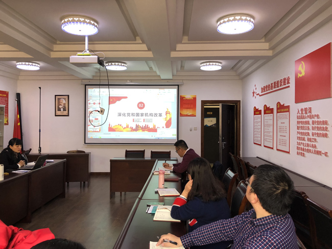 最后,支部书记屠丽环给支部全体党员上了内容丰富的党课,组织学习贯彻党的十九届三次会议精神,带领全体党员深入学习领会《中共中央关于深化党和国家机构改革的决定》。