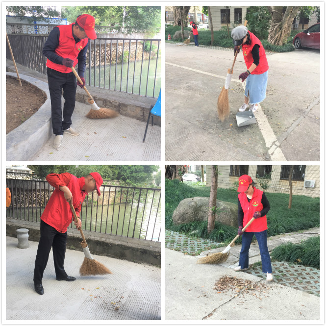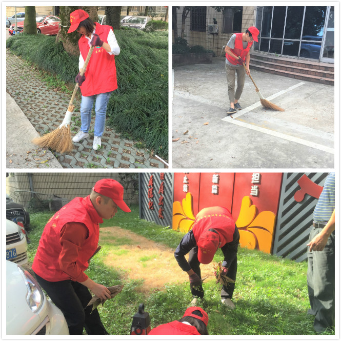首先开展的是环保志愿活动,全体支部党员身穿红马甲志愿服、头戴小红帽在院内展开热火朝天的劳动,有的清扫地面,有的拔掉杂草,看到院子草丛里、树脚下都干干净净,党员们都露出了开心的笑容。