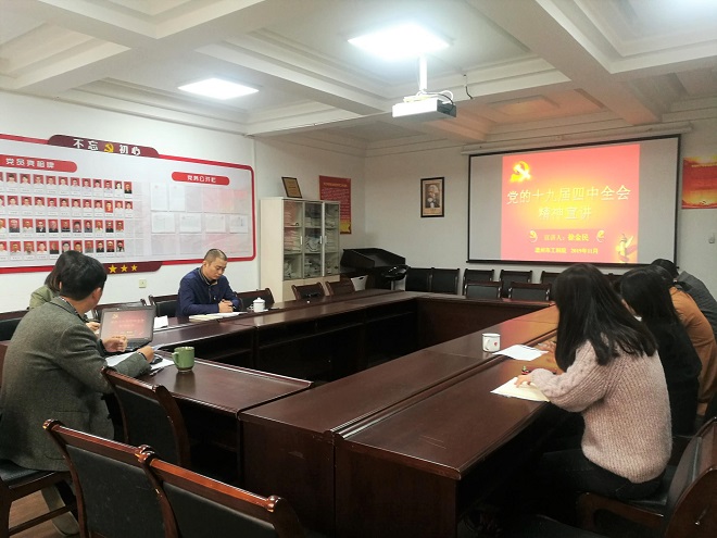 院党委书记徐金民同志为大家宣讲党的十九届四中全会精神,徐书记把全会的基本情况、会议内容中的十三个显著优势、全会总体目标、全会工作要求的十三个坚持和完善一一向大家讲述,让全体党员对全会精神有了更加全面的理解。