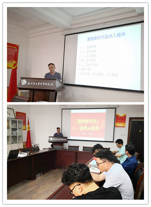 接下来,支部党员学习温组发[2020]41号——关于印发《进一步发挥组织作用助推达能扩产 助力化危为机组织保障八条举措》的通知。党委委员、支部书记王赋开展题为《激扬新时代温州人精神》的党课,分别从地理、历史、文化、人民、新时代等五个方面阐述“敢为人先,特别能创业创新”的温州人精神。
