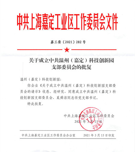 2021年4月28日上午,在喜迎建党一百周年之际,中共温州(嘉定)科技创新园支部委员会正式成立,园区将坚持“党建强发展强”的工作理念,以党建为引领,坚持“研发在上海,转化在温州,产业在温州的”合作模式,加快融入长三角。