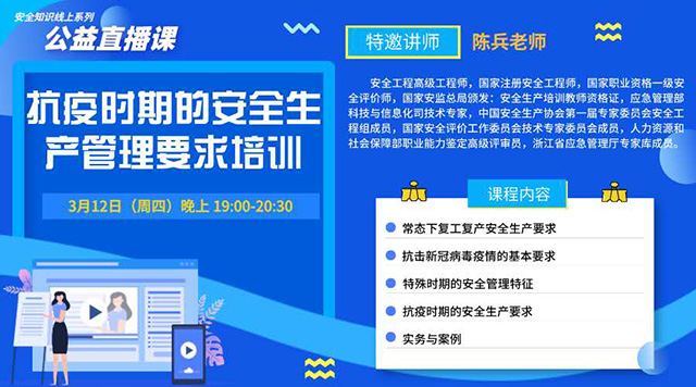 课程内容包括:1、常态下复工复产安全生产要求;2、抗击新冠病毒疫情的基本要求;3、特殊时期的安全管理特征;4、抗疫时期的安全生产要求;5、实务与案例。本次线上公益培训引导和教育企业员工提高安全意识,掌握疫情防控相关知识,帮助企业在疫情期间练好内功,夯实复工复产基础。