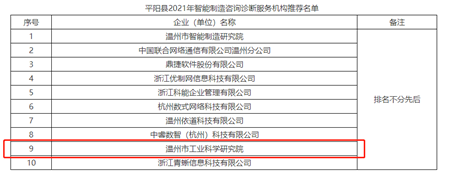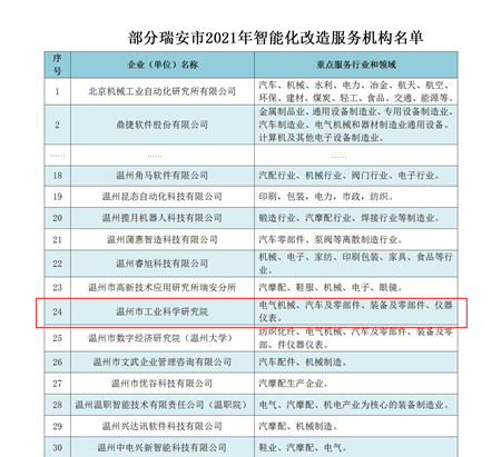 近日,乐清市经信局、平阳县经信局、瑞安市经信局分别公布了《关于2021年智能化改造咨询诊断服务机构遴选结果的公示》、《关于平阳县2021年智能制造咨询诊断服务机构推荐名单公示》和《瑞安市2021年智能化改造服务机构的通知》,我院成功入选三大县市服务机构名单。