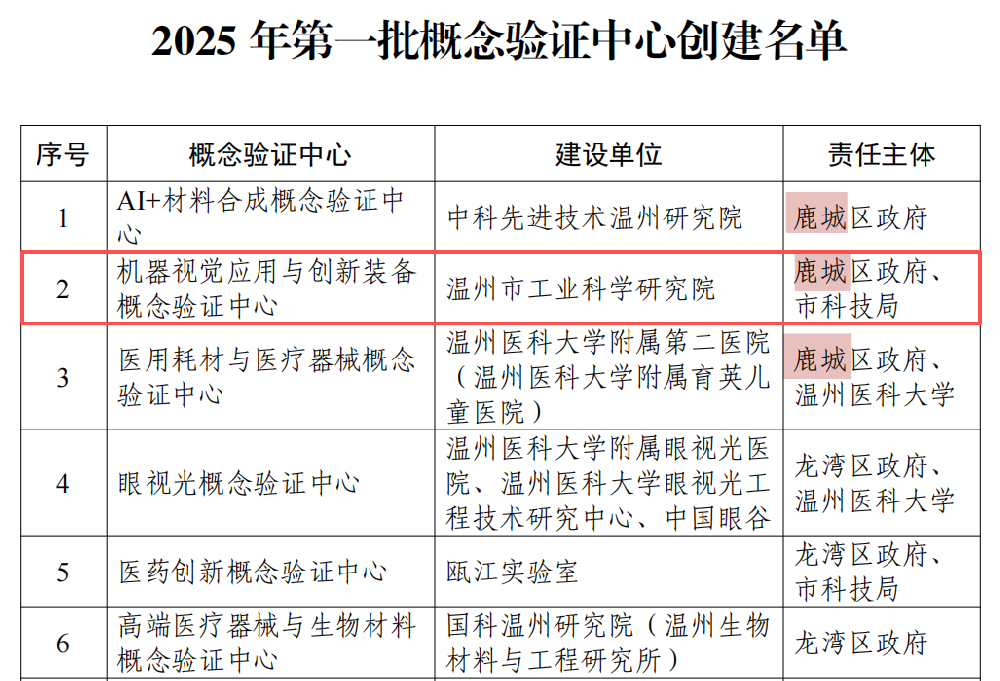 近日,中共温州市委教育科技人才一体化委员会办公室公布《关于2025年第一批概念验证中心创建名单的通知》,全市共18家单位入选。温州市工业科学研究院牵头建设的“机器视觉应用与创新装备概念验证中心”凭借其全链条转化服务能力和成果产品化实效,成功入选温州市首批概念验证中心之一。